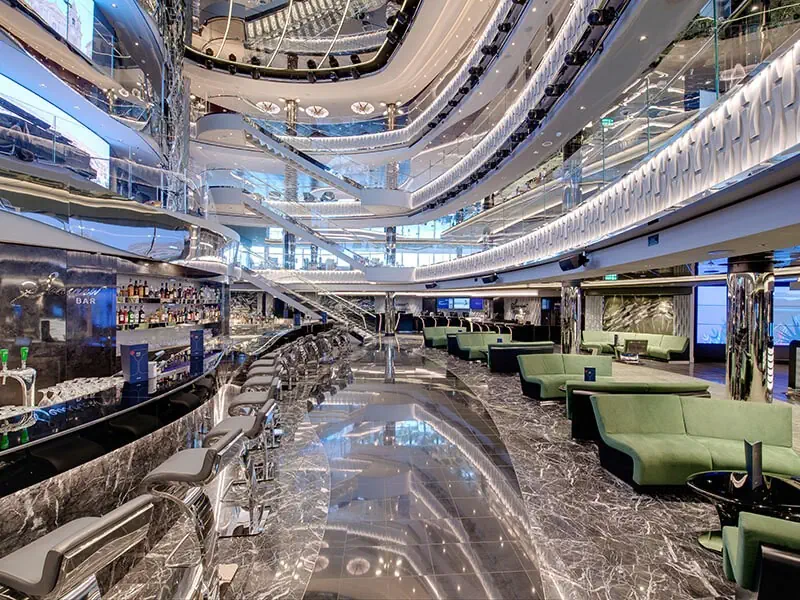 RESTAURACJE: Na statku znajduje się duży wybór restauracji, gdzie każdy znajdzie coś dla siebie - 2 restauracje główne a’la carte (Seashore i Ipanema), 2 restauracje w formie bufetu (Marketplace i Biscayne z pizzerią), restauracja rybna Ocean Cay (dodatkowo płatna), restauracja orientalna Teppanyaki (dodatkowo płatna) i restauracja z amerykańskimi stekami Butcher’s Cut (dodatkowo płatna). Ponadto na statku znajduje się 20 różnorodnych barów, w tym m.in. News Cafe & Comedy Club z występami komików, Bar Atrium ze ścianą ze szkła rozciągająca się na 2 pokłady z muzyką na żywo oraz fabryka czekolady i lodziarnia. Każdy klient podczas rejsu ma zagwarantowane pełne wyżywienie, tj. śniadania, obiady, podwieczorki i kolacje. Posiłki podawane są w restauracji bufetowej, jak również we wskazanej restauracji a’la carte, co daje możliwość wyboru miejsca posiłków każdego dnia. Śniadania – napoje kawa, herbata, woda i soki w cenie. Obiady i kolacje – wybór spośród zup, dań mięsnych, rybnych i wegetariańskich oraz dania z grilla i włoska pizza. Podczas obiadów podawane są desery i owoce. Podwieczorki – przekąski, sałatki, kanapki, ciasta, kawa i herbata. Napoje do kolacji są dodatkowo płatne (nie dotyczy gości z wykupionym pakietem napojów „Easy” lub „Easy Plus”). Podczas kolacji mile widziane są eleganckie stroje. Niektóre restauracje tematyczne a’la carte są dodatkowo płatne. Dla osób podlegających specjalnej diecie dostępne jest specjalne menu – taką informację należy podać przy rezerwacji rejsu.